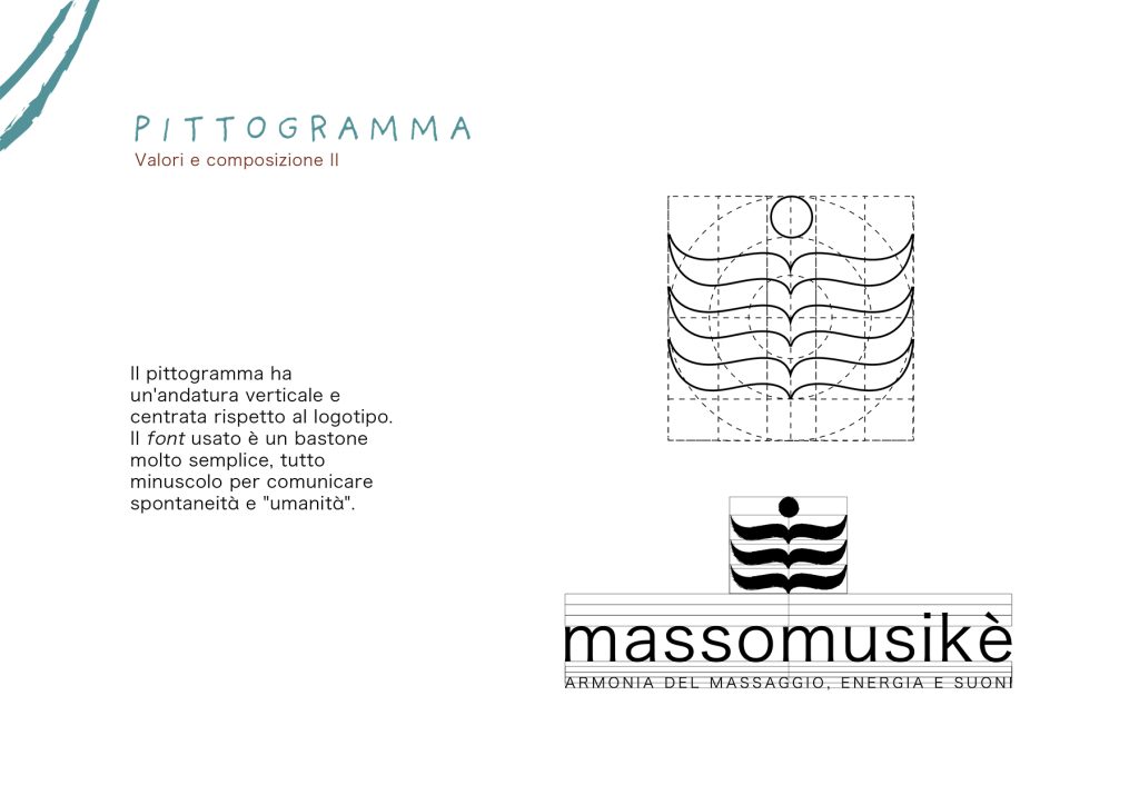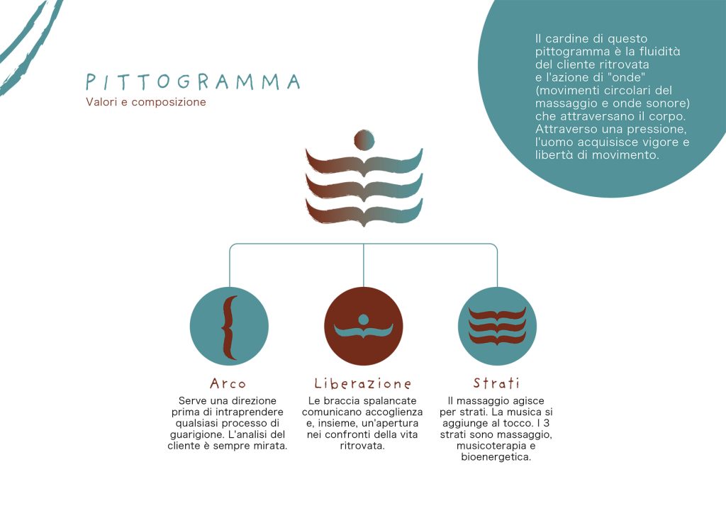 Il cuore dell’identità visiva è il pittogramma: una forma fluida, verticale e centrata, che richiama il movimento delle onde — quelle circolari del massaggio e quelle sonore della musica — mentre attraversano il corpo. La pressione diventa trasformazione: da rigidità a vigore, da chiusura a libertà di movimento. Il segno visivo racconta l’individuo nel momento in cui si riallinea, ritrovando equilibrio e presenza.